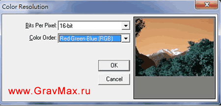 Цветовое разрешение позволяет настроить битность пикселей, порядок цветов, дизеринг и палитру (метод дизеринга и палитра должны быть в 8-битном режиме), см. следующие примеры.